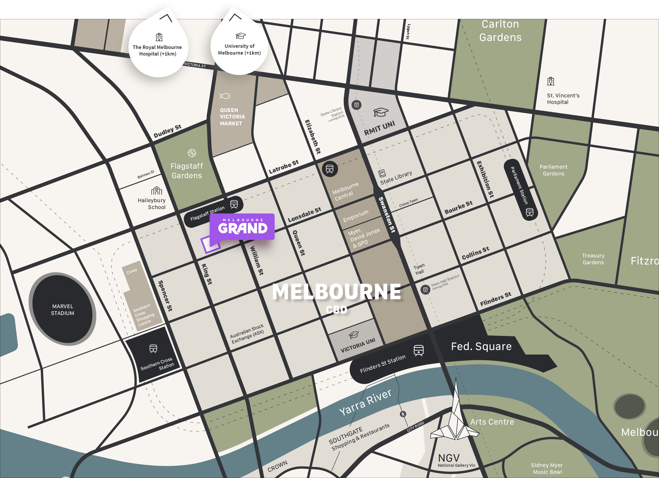 Experience a Grand lifestyle, where the city’s finest attractions are right on your doorstep. Live minutes from Melbourne’s iconic shopping, entertainment, transport, education and business destinations.